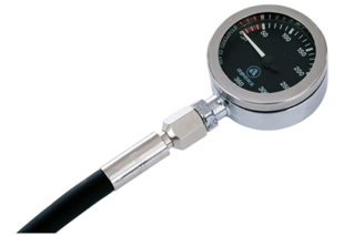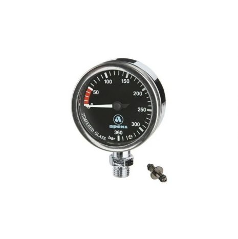 Kvalitní kovový manometr firmy APEKS s černou stupnicí a tělem z niklované mosazi. Tvrzené minerální sklo, pracovní tlak 300Bar. Stupnice do 360 Bar. Průměr 52mm. Součástí manometru je SWIVEL ( osička s O-kroužky ). Nutno dokoupit vysokotlakou hadici.