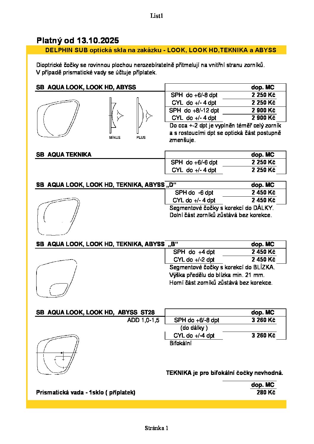 Zakázková výroba dioptických skel do masky Aqualung LOOK. Maska LOOK sedí téměř každému a je jednou z nejlepších masek na světě o čemž svědčí to, že se vyrábí již více jak 37 let téměř beze změny. Pro objednání skel kontaktujte naší firmu. Je možné vyrobit 4 varianty skel viz. přiložená tabulka. Skla pasují i do staršího modelu masky LOOK HD, který se již nevyrábí. Jedná se o precizní výrobek nejvyšší optické kvality, který máme v nabídce již více jak 20 let. Za tu dobu máme stovky spokojených zákazníků, kteří se k nám stále vracejí.