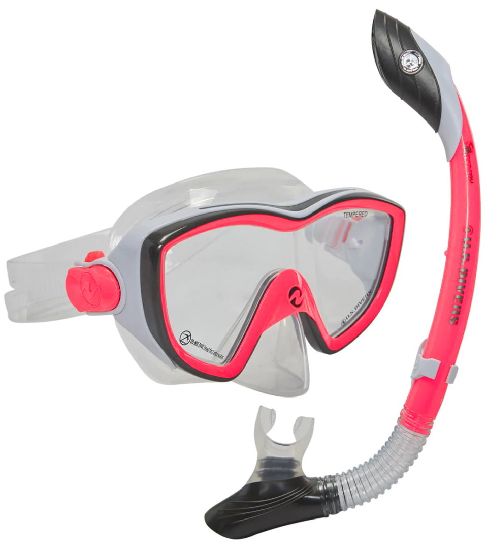 Diva LX Combo je navržena v atraktivních barvách pro ženy. Měkká silikonová lícnice pohodlně přiléhá k obličeji a zajišťuje nepropustnost, zatímco jednozorníková konstrukce otevírá divy podvodního světa. Dělený pásek u masky a snadno nastavitelné přezky Pro Glide udrží masku na místě a zároveň minimalizují zamotávání vlasů. Šnorchl Island Dry je vybaven technologií Dry Top, která utěsňuje šnorchl při ponoření pod hladinu, s ohebnou částí, která zmírňuje únavu čelistí.